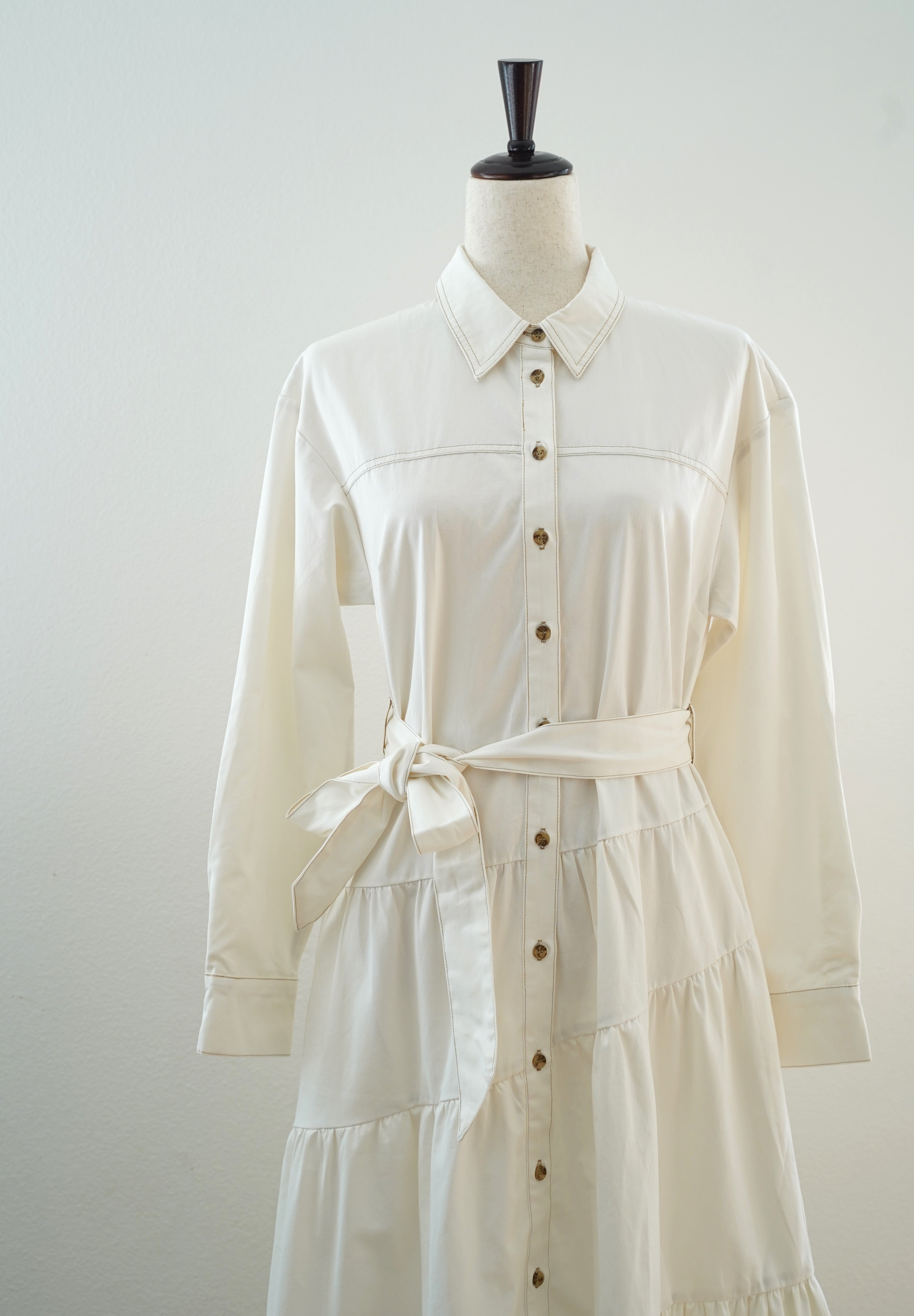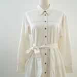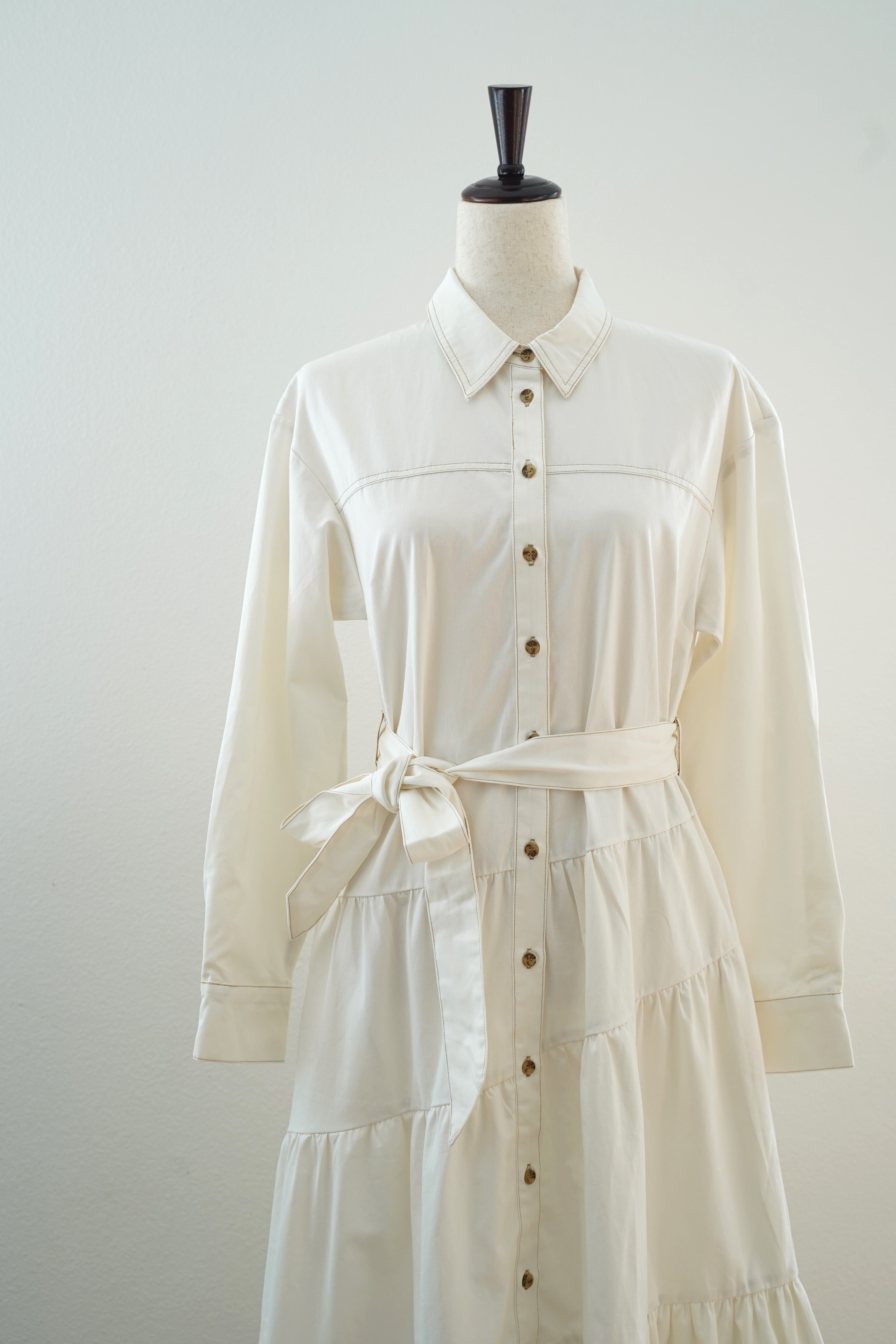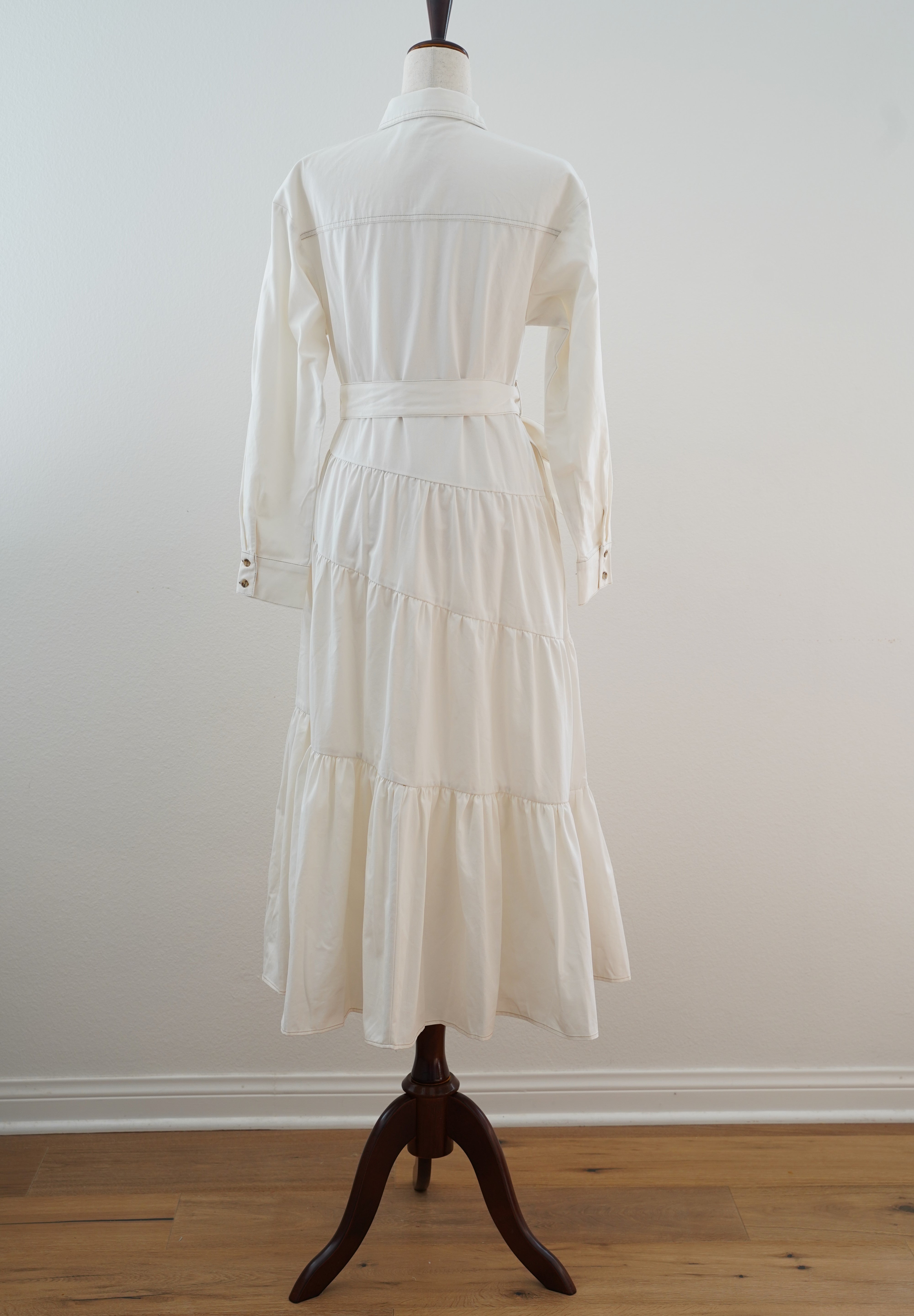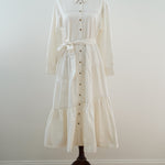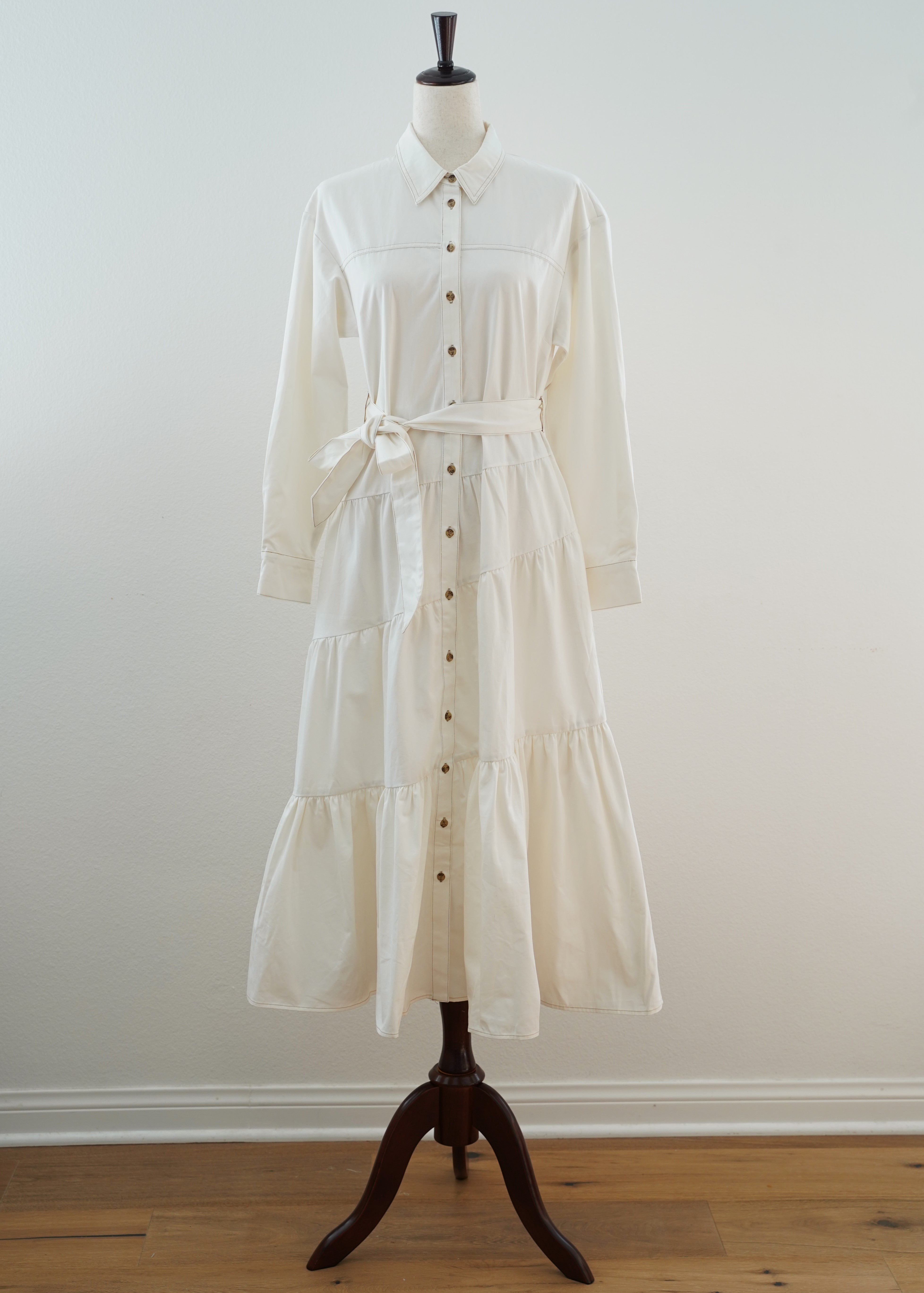 The Evelyn Tiered Midi Dress features a collared neckline, button-front, and long sleeves. Its tiered skirt with a self-sash tie creates a refined silhouette for versatile wear.