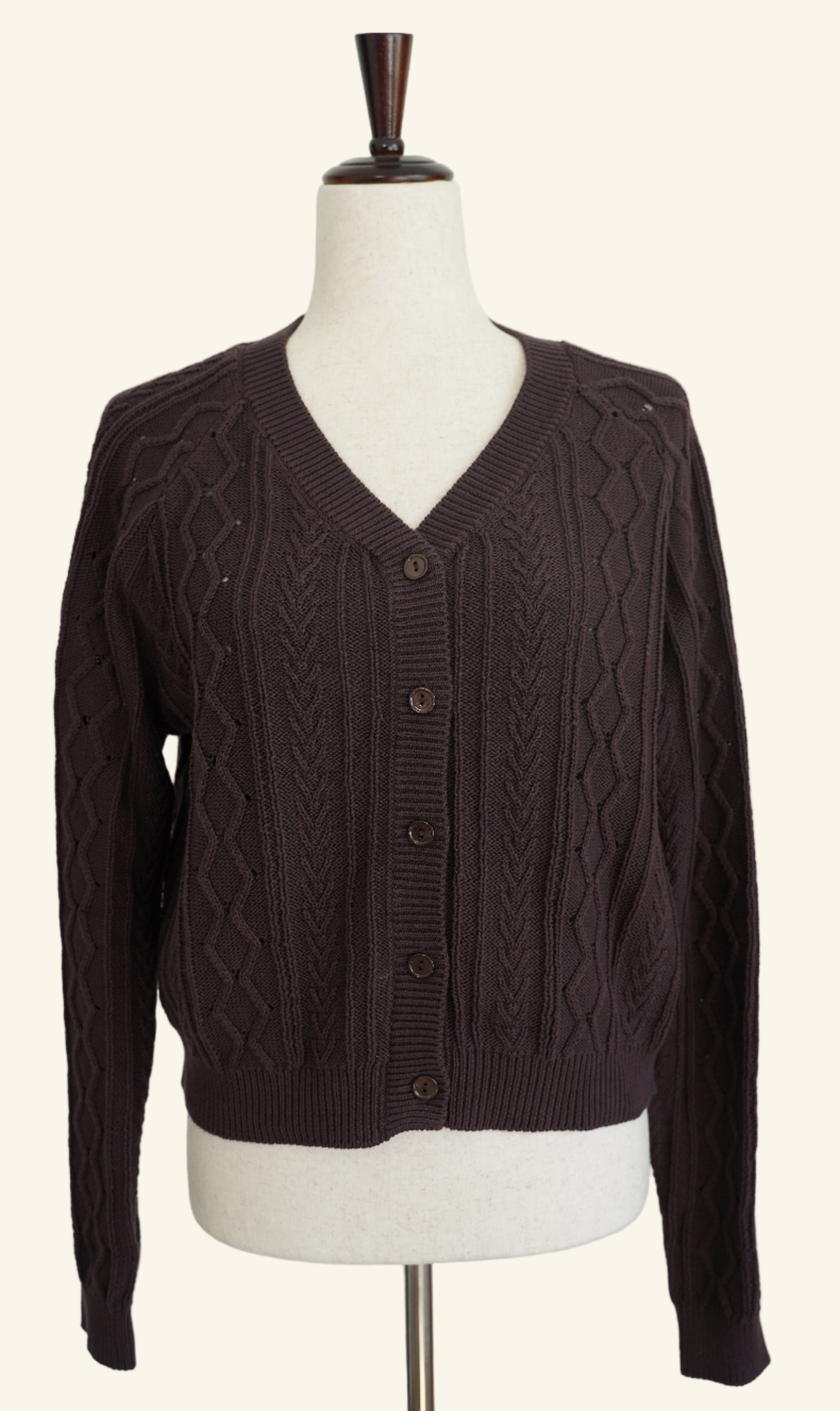 Beautifully knit from 100% cotton, this classic cardigan embodies timeless ease and understated elegance. Designed with a soft cable texture, ribbed trim, and a refined V-neckline, it’s finished with functional buttons for effortless layering.