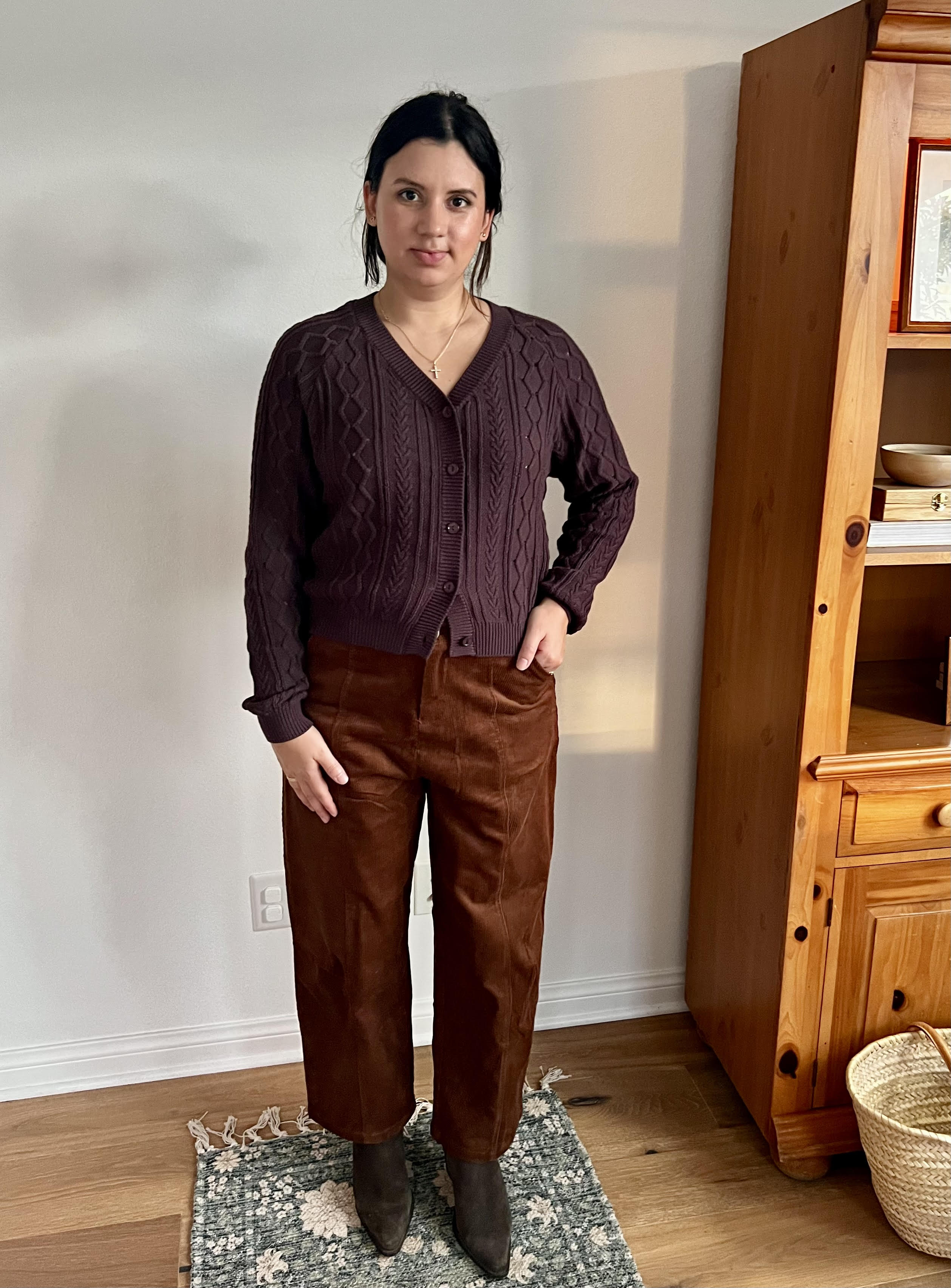 Model is wearing size Medium paired with our Beckett Barrel Corduroy Trousers.