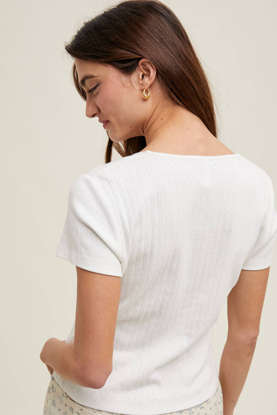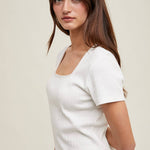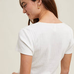 The Meadow Pointelle Top features a delicate knit design with a square neckline and short sleeves. Crafted from 100% cotton for a soft, breathable fit.
