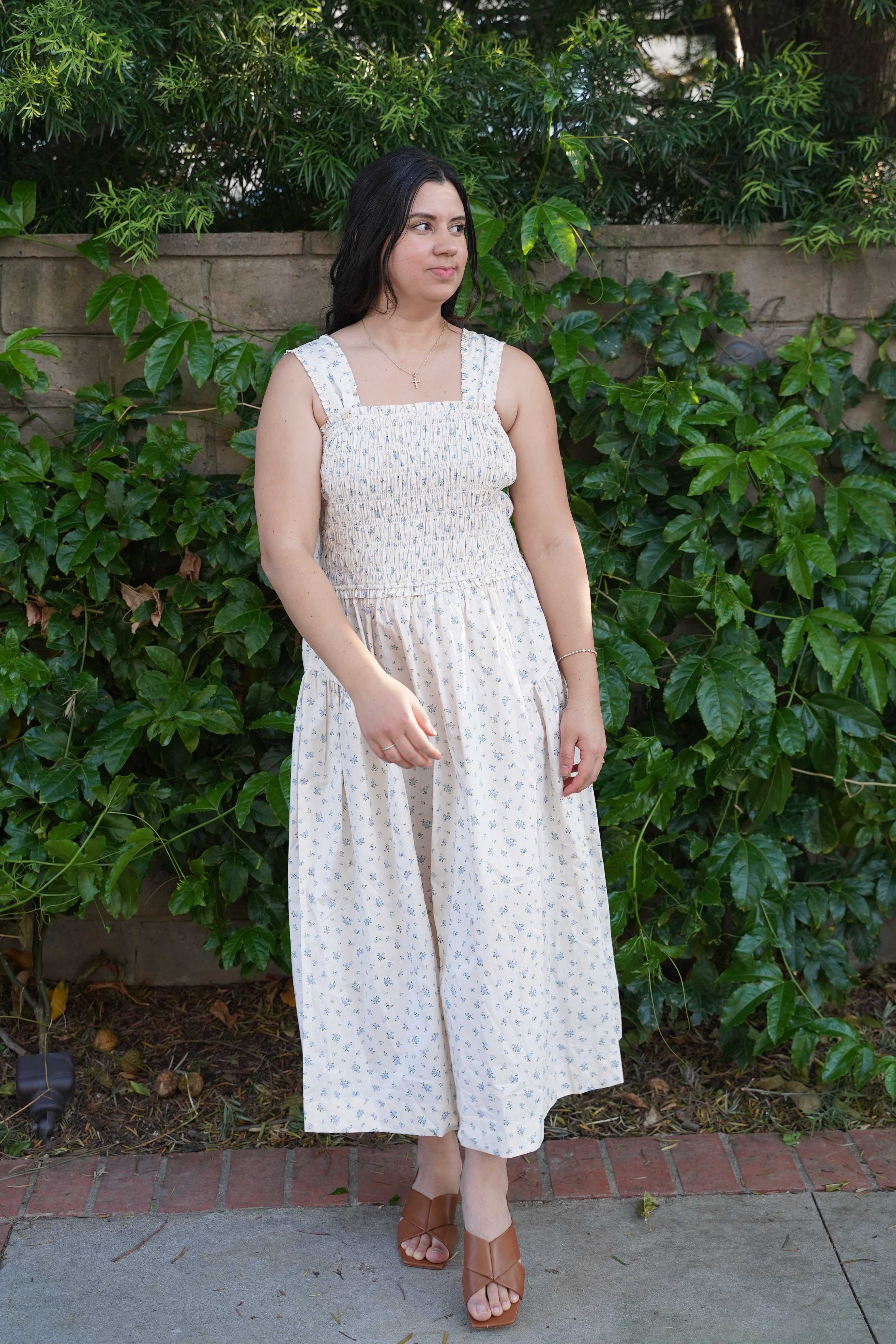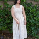 The Emmeline Dress is soft, timeless, and quietly romantic. Crafted from 100% cotton in a delicate blue and ivory floral, it features a flattering smocked bodice and feminine bow details at the back. The midi length adds effortless elegance, while the unlined cotton keeps it light and breathable.